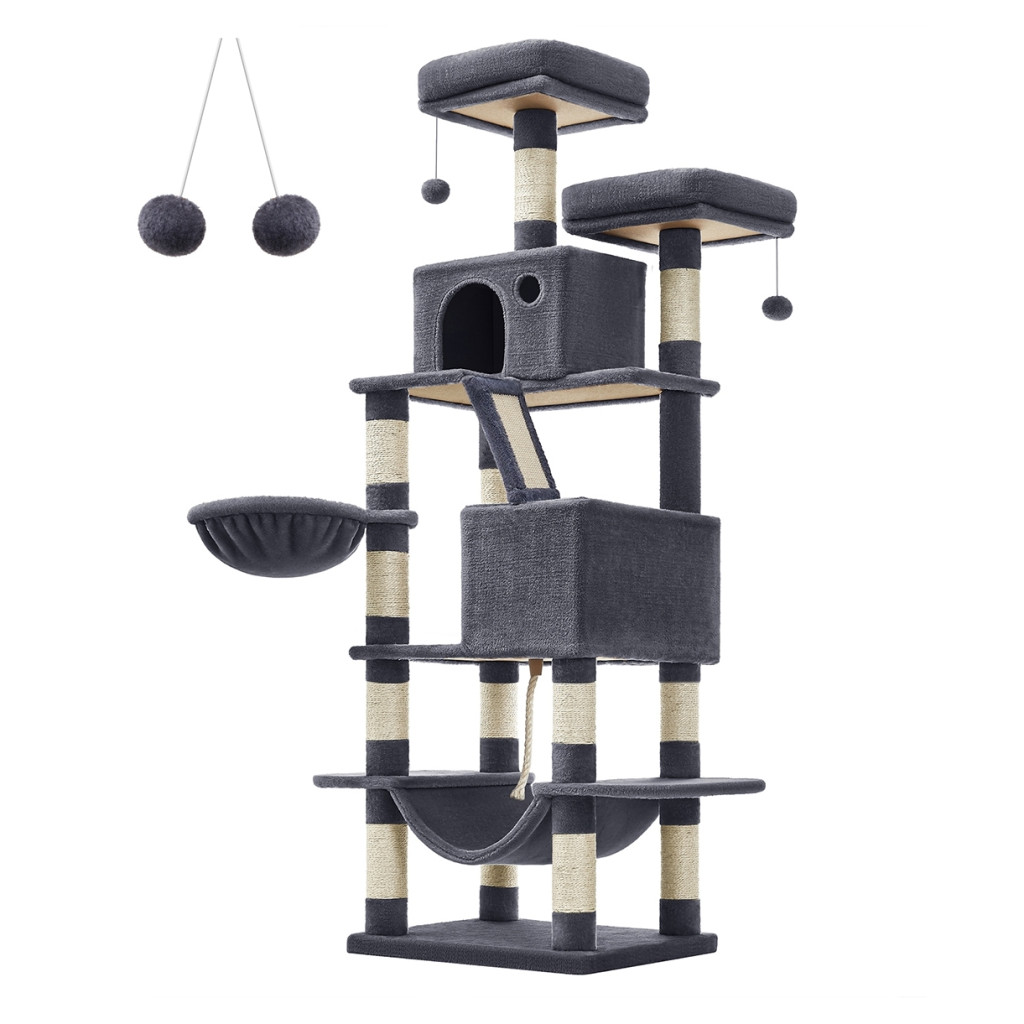 Minden-az-egyben játszótér: 2 jól párnázott ülőplatformmal, 2 puha macskabarlanggal, 1 bolyhos kosárral, 2 pomponnal és 1 függőággyal, amely felett 1 játszókötél található, kis szőrös kedvenceid mindig megtalálják a kényelmet és a szórakozást ezen a többszintes macskafán.