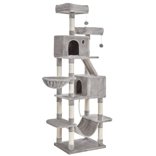 Minden-az-egyben játszótér: 2 jól párnázott macskaülőke, 2 kényelmes macskabarlang, 1 bolyhos kosár, 2 pompom és 1 függőágy 1 játékkötéllel felette – kis szőrgombócaid mindig megtalálják a kényelmet és a szórakozást ezen a többszintes macskatornyon.