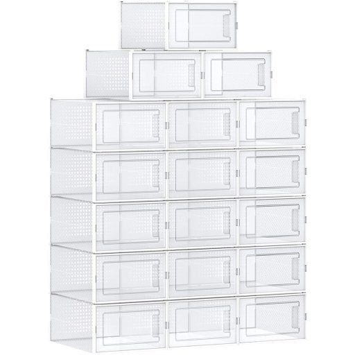 Amit kapsz: 18 darab átlátszó cipősdoboz csomag, átlátszó elülső ajtóval, halmozható és összecsukható kialakítással, szellőzőnyílásokkal. Mondj búcsút a szétszórt cipőknek, és tedd rendbe a cipőidet most!