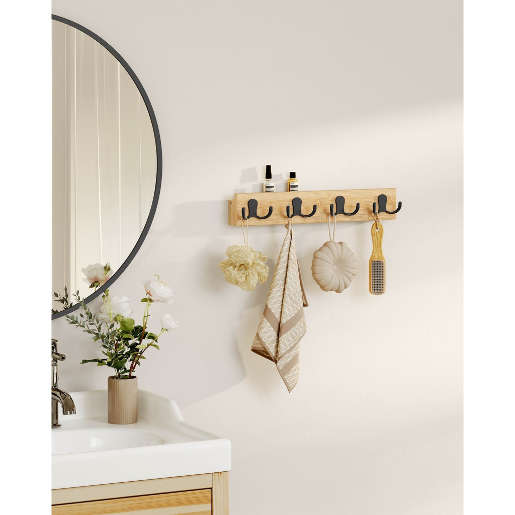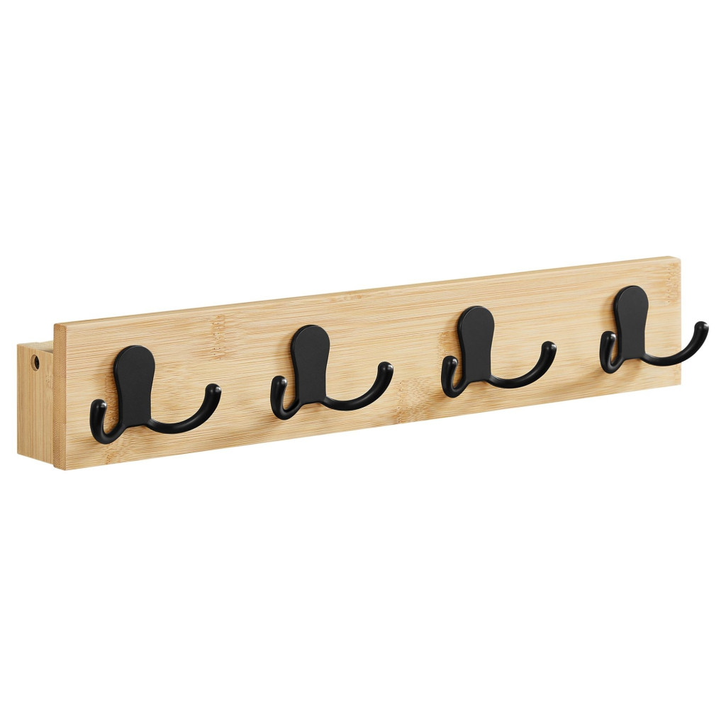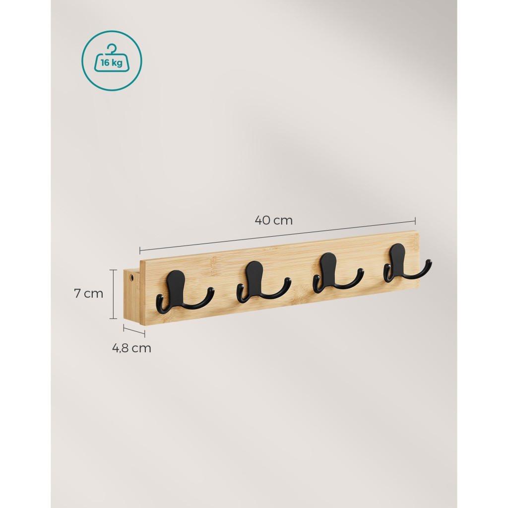 SONGMICS Fali ruhaakasztó, 4 dupla akasztóval, 16 kg teherbírás, natúr és feketePraktikus duplakampók: A falra szerelhető fogas 4 sima felületű duplakampóval rendelkezik. Ruháit rendezetten és biztonságosan felakaszthatja rájuk, így kellemes benyomást kelt.