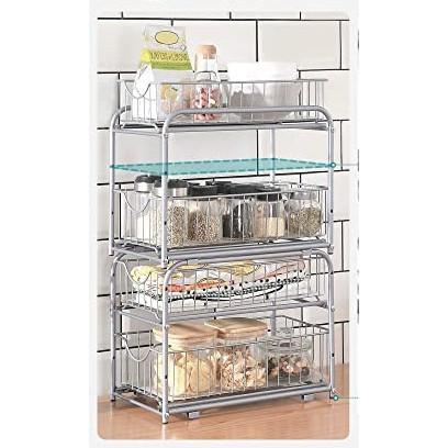 Mit kap: Egy konyhai rendszerezőt 2 polccal és 4 csúszásmentes műanyag lábbal, amelyek megvédik a tetejét a karcolásoktól és extra stabilitást biztosítanak, valamint 2 kihúzható fiókot a tárgyai tárolására