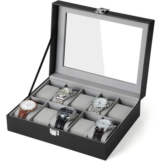 SONGMICS Műbőr óratároló doboz 10 rekesszel, üvegfedéllel, fekete 25x20x7cmMinden fillért megér: szerezze be ezt az óratartó dobozt a Songmics-tól, és élvezze a jó ár-érték arányt és a kifinomult kidolgozást.