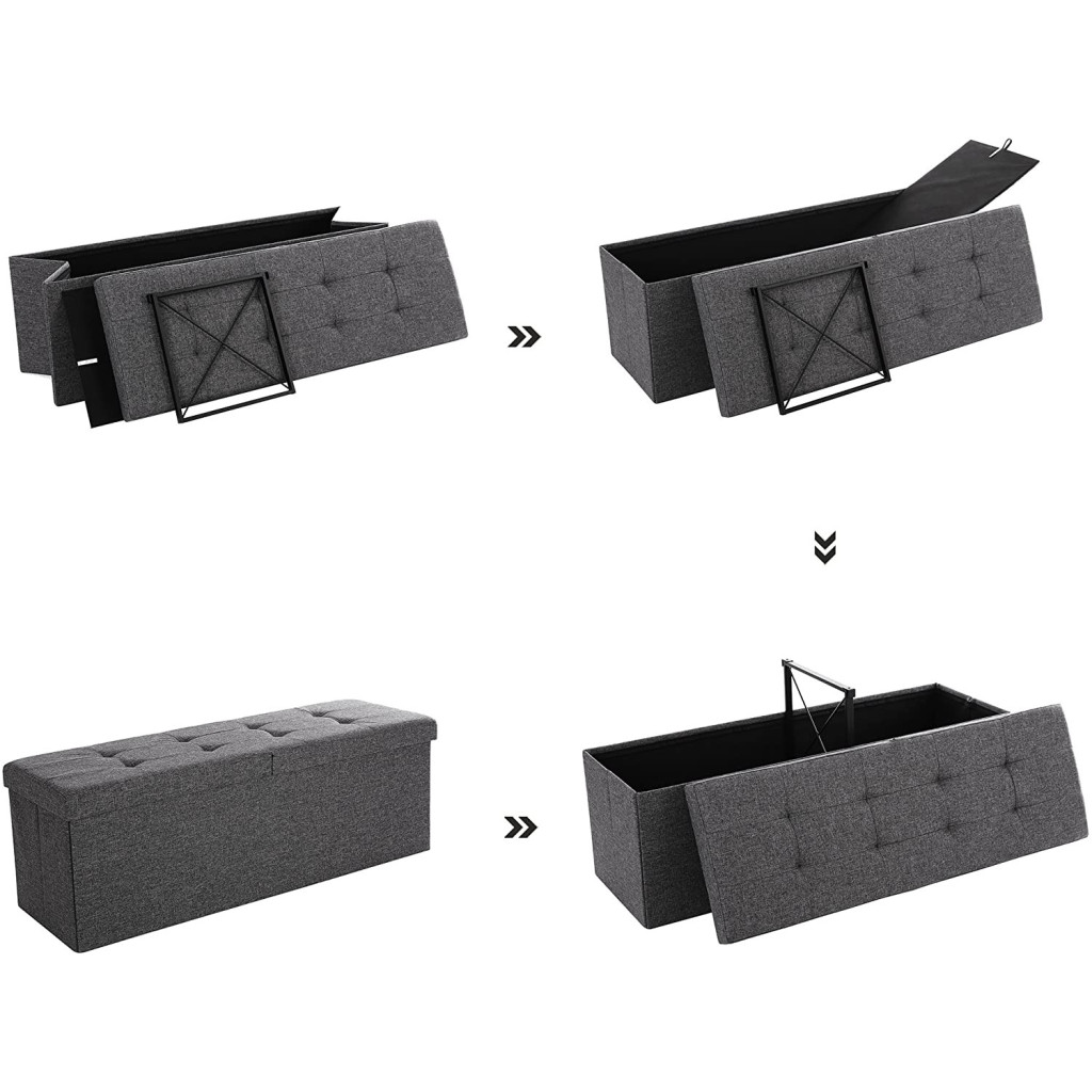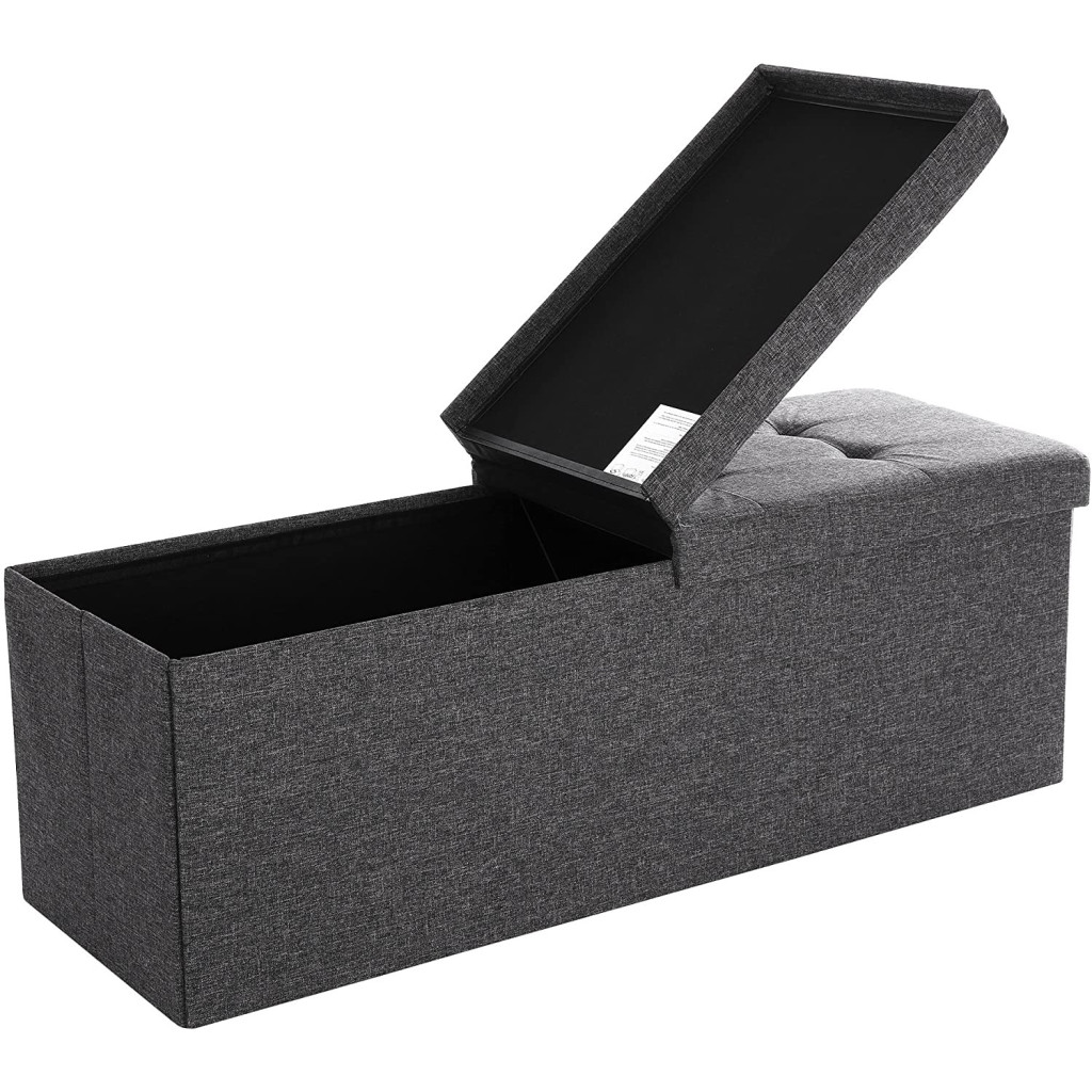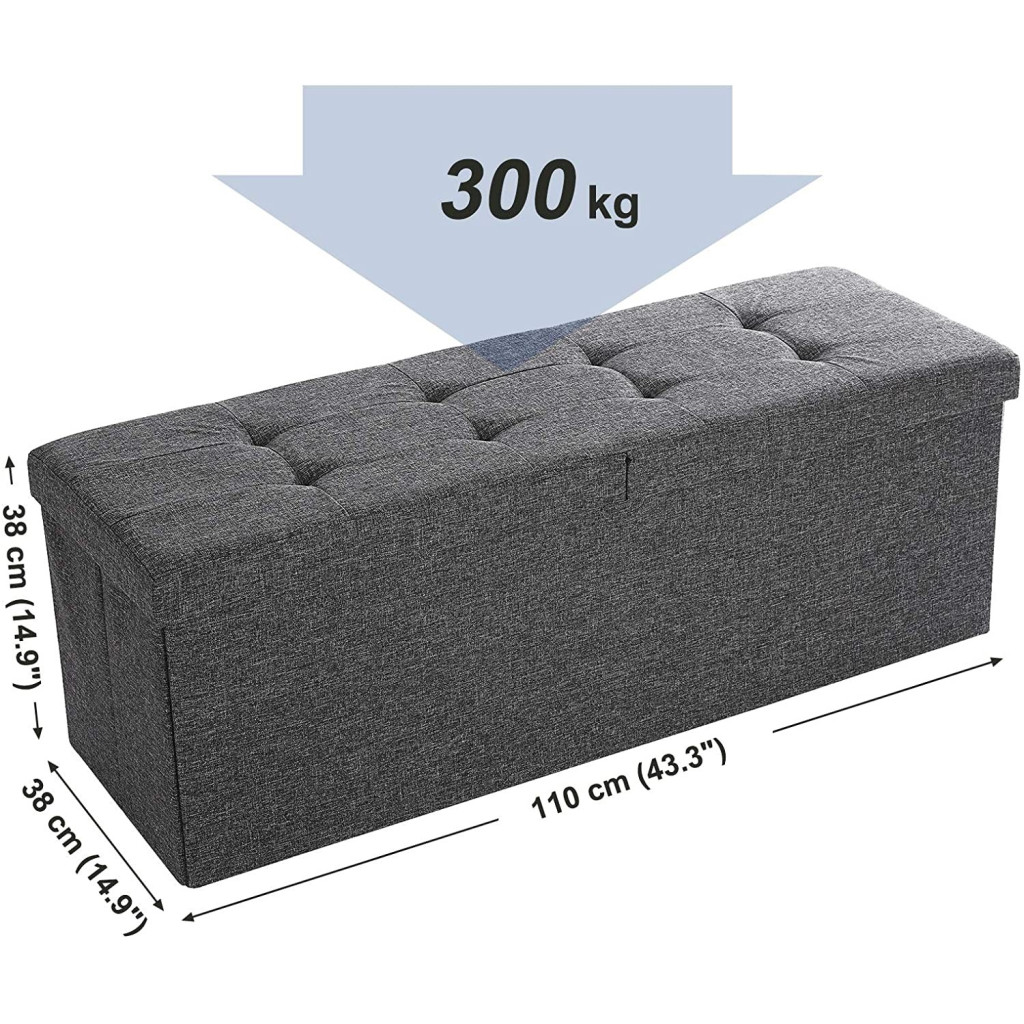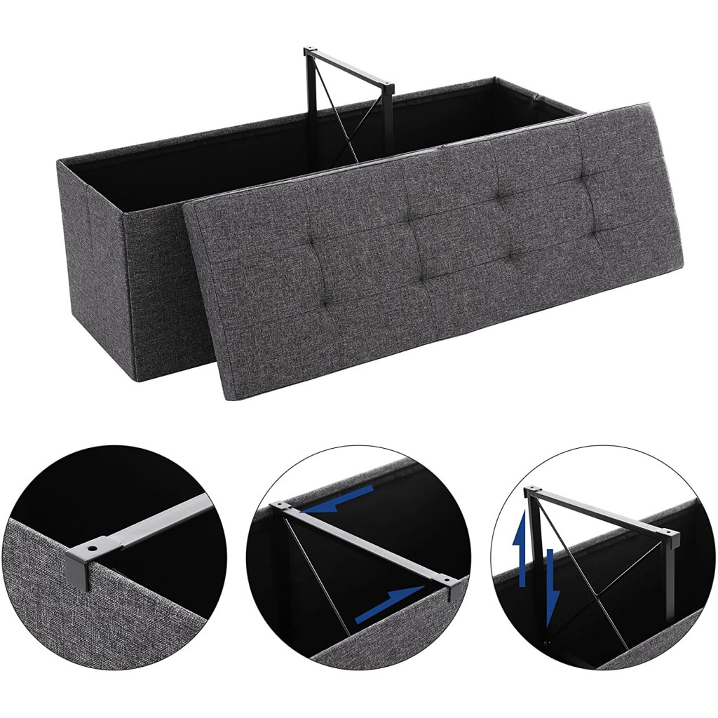 SONGMICS Összecsukható vászon tárolópuff, felnyitható ottomán, sötétszürke 110x38x38cmÖsszecsukható ülés összecsukható fedéllel A fedél mindkét oldalról nyitható; gyorsan és egyszerűen kihúzhatja vagy behelyezheti a tárgyakat anélkül, hogy az egész fedelet eltávolítaná. Ha nincs használatban, összecsukható és tárolható, hogy helyet takarítson meg.