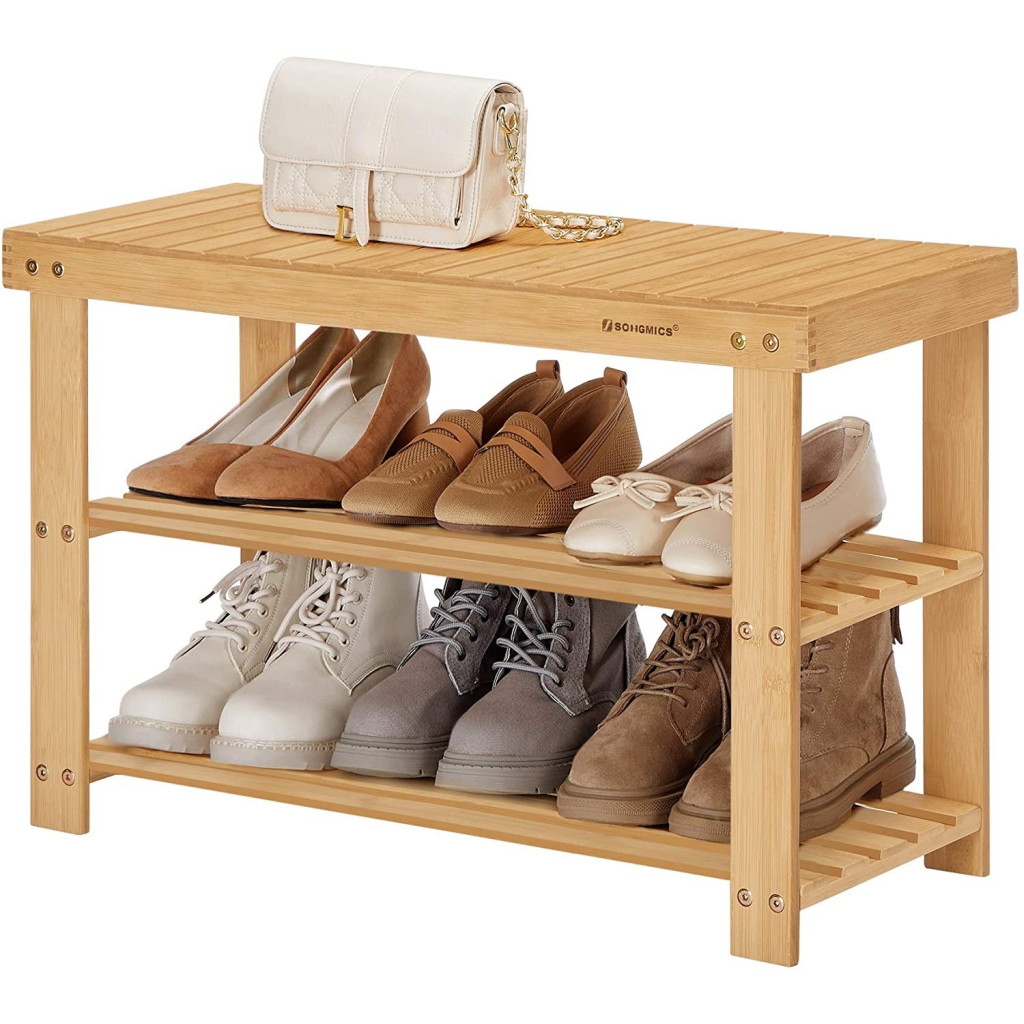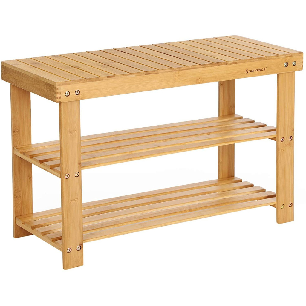 SONGMICS Bambusz cipőtároló polc 3 szintes, natúr 70x28x45cmStabil és Robusztus - A természetes bambusz deszkából készült, csíkos mintázatú, nagy teherbírású pad maximális stabilitást biztosít, és lenyűgöző 120 kg-ot bír el.
