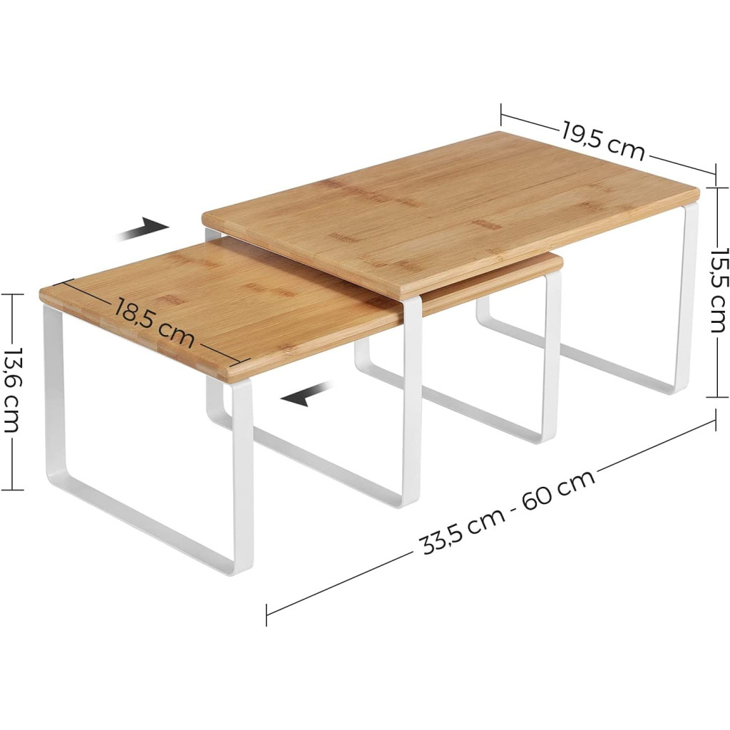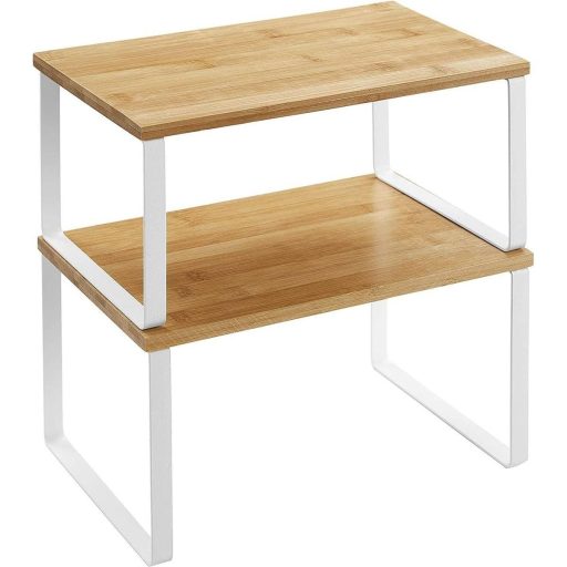 SONGMICS Bambusz konyhai rendszerező polcok, 2 db-os egymásra rakható, fehér lábakkalHol hiányzik egy polc? A rendetlen pulton, szekrényben vagy kamrában? Hozd be ezt a 2 polcot, hogy bővítsd a tárolóhelyedet; fűszeres üvegek, konzerváruk—mindezek a káoszteremtők megszelídíthetők.
