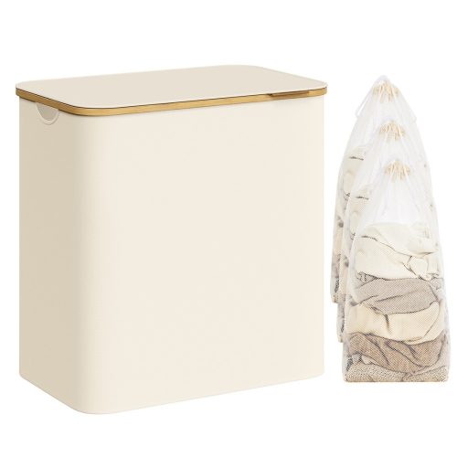 SONGMICS Szennyestartó Oxford szövet, 150L, kivehető hálós zsák, bambusz fogantyú krémfehér3 Tágas Rekesz: Ez az 52,8 gallon (150L) kapacitású szennyestartó, amelynek méretei 60 cm hosszú, 38,5 cm széles és 70,5 cm magas, 3 rekesszel rendelkezik, tökéletesen alkalmas egy több személyes család ruháinak szétválogatására és tárolására, egyszerűsítve a mosási rutint