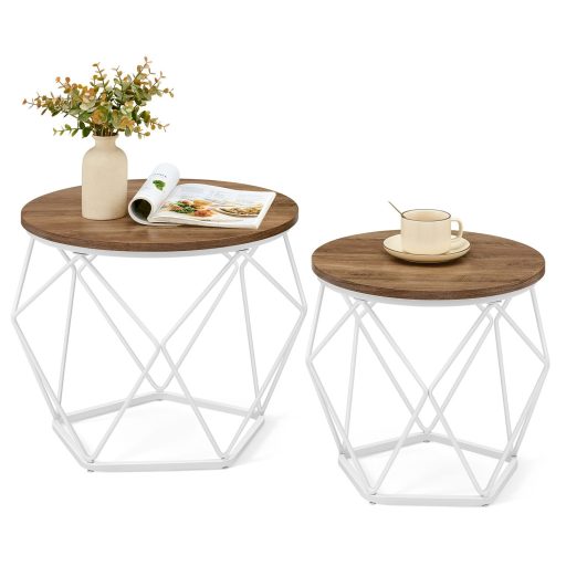 Modern Stílus: Ezek a modern stílusú dohányzóasztalok különleges hangulatot hoznak a nappalijába, kerek mézbarna tetejükkel és geometrikus fehér acél alapjukkal. Vonzó megjelenésük lenyűgözi vendégeit