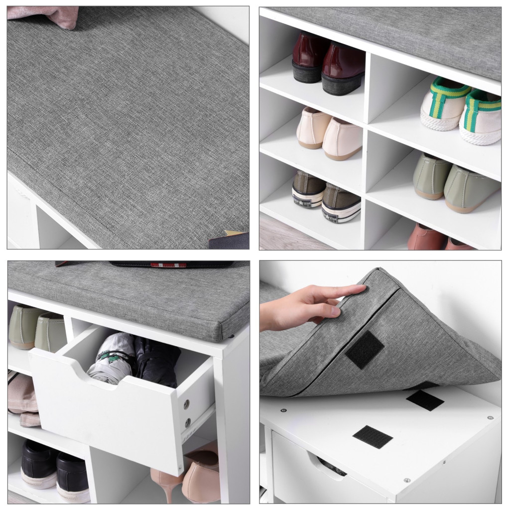 VASAGLE Cipőtároló pad, fiókkal és nyitott rekeszekkel, párnázott ülőfelülettel, fehér és szürke 104x30x48cmKiegészítők Rendben: Késésben van a munkából, de sehol sem találja a kulcsait vagy a szemüvegét? Ezzel a tároló paddal ez többé nem fordul elő. Tárolja a szükséges dolgokat a fedél alatt, így nem kell többé kapkodnia, mielőtt elindulna.