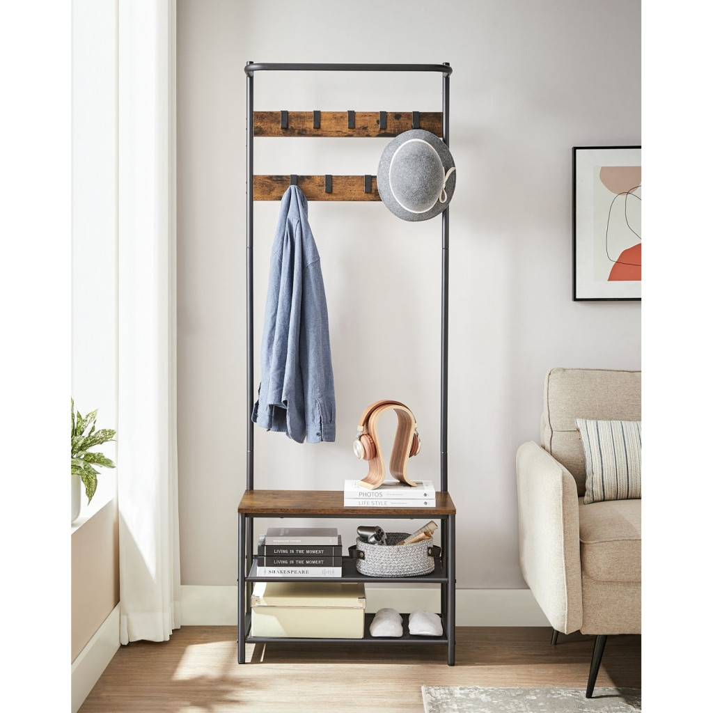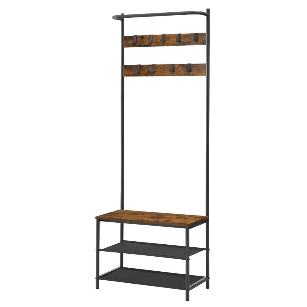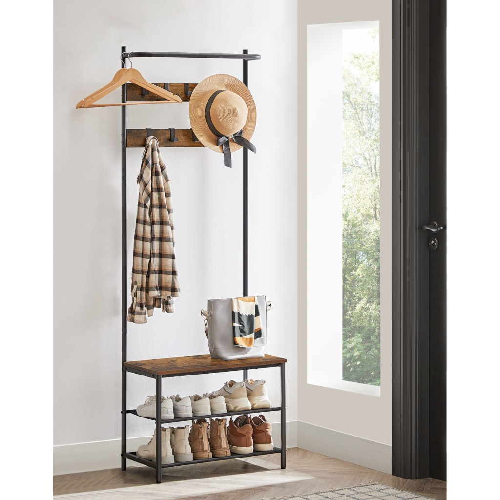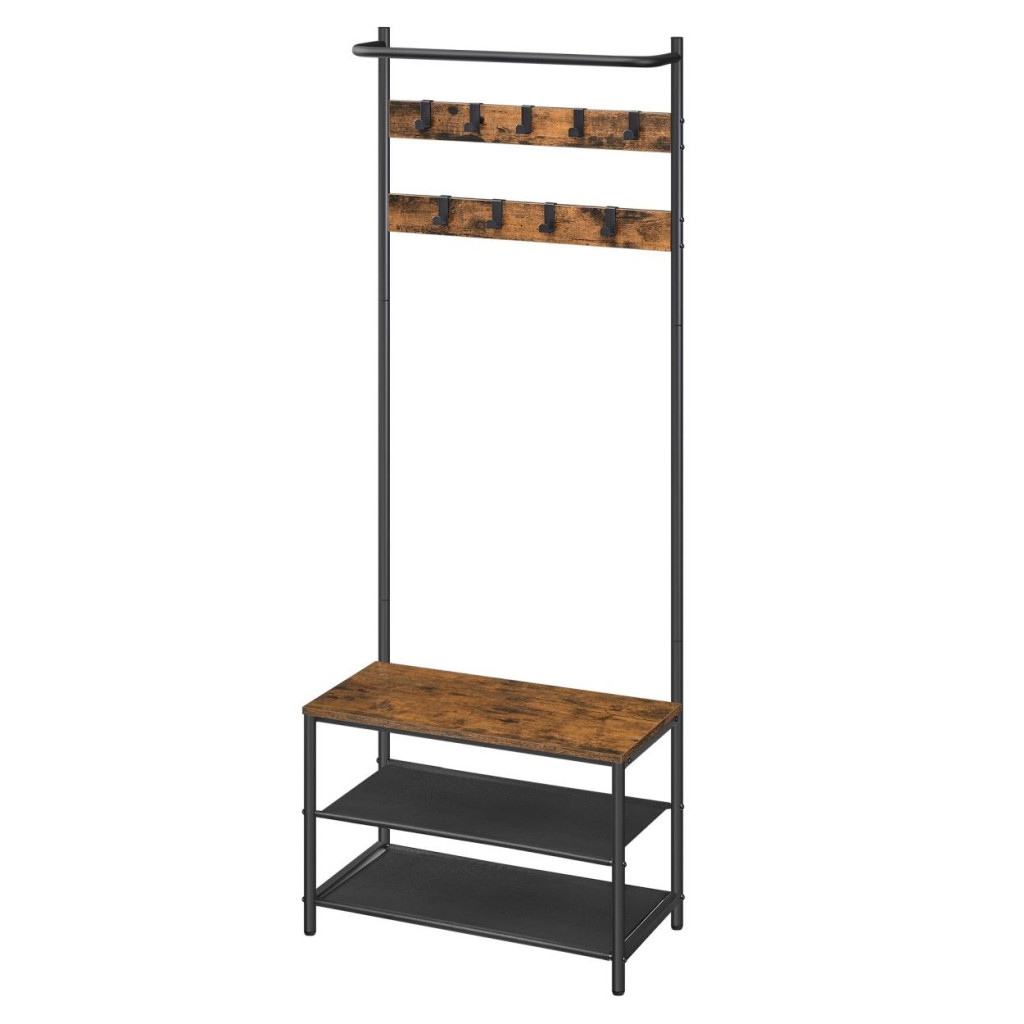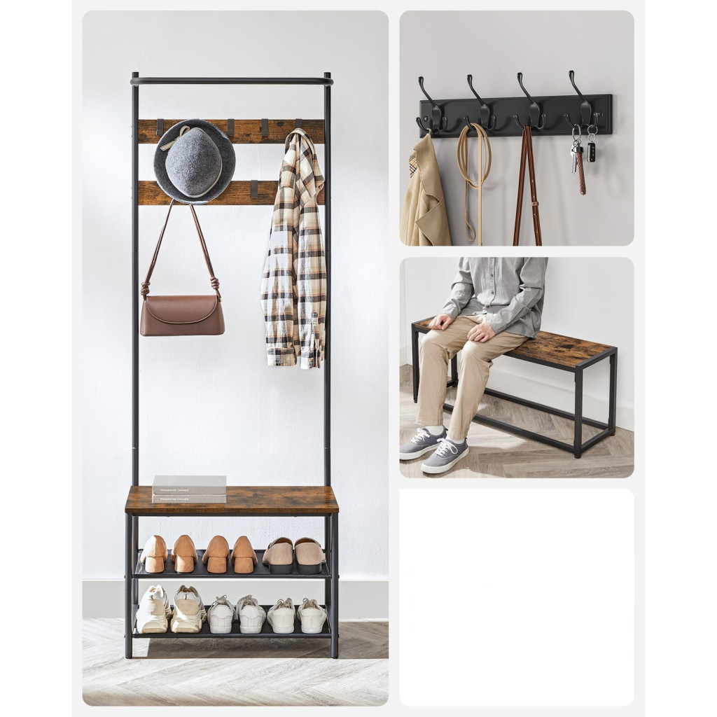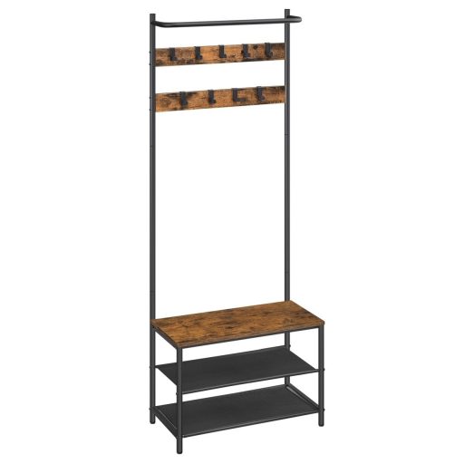 VASAGLE Előszoba fogas, kabáttartó, cipőtároló paddal, rusztikus barna 64x32x180cm3 az 1-ben kabáttartó: ez a multifunkcionális ruhatartó 9 akasztóval, 2 polccal és egy üléssel lehetővé teszi, hogy felakaszd a ruháidat, tárold a cipőidet és kényelmesen ülj le cipőcseréhez