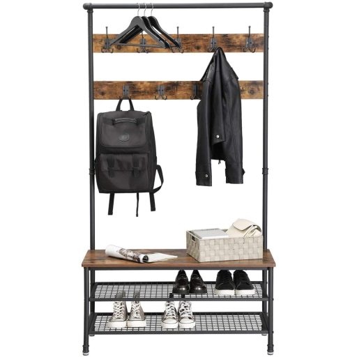 VASAGLE Előszoba fogas polccal, akasztókkal, cipőtartóval és ülőkével, rusztikus barna 97x41x182cmÜdvözöl Otthon: Szabaduljon meg az előszobai rendetlenségtől ezzel az okos kabát- és cipőtartóval; amely tökéletes egyensúlyt teremt az egyszerű sziluett, az ipari cső stílus és a könnyedén rusztikus vonzerő között.