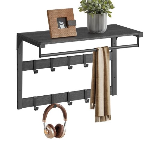 VASAGLE Fali ruhafogas akasztókkal és polccal, fekete 65x30x42cm3 az 1-ben Kialakítás: A polccal, levehető akasztókkal és egy függesztősínnel ellátott falra szerelhető kabáttartó lehetővé teszi, hogy egy kényelmes helyen kiállítsd, rendszerezd és felakaszd a dolgokat.