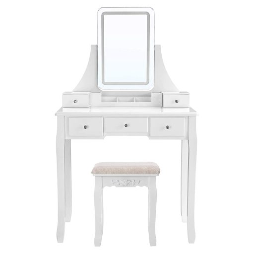 VASAGLE Fésülködőasztal, sminkasztal állítható tükörrel fiókokkal párnázott székkel és világítással, fehér 9LED világítás 3 színnel és állítható intenzitással: rövid nyomással válthat a színek között, hosszú nyomással állíthatja az intenzitást, így megtalálhatja a megfelelő fényt és tökéletes sminket érhet el