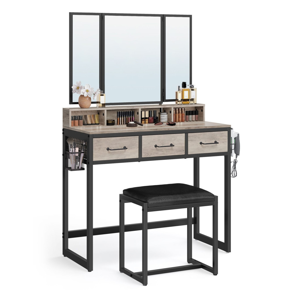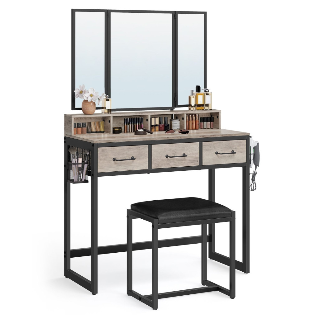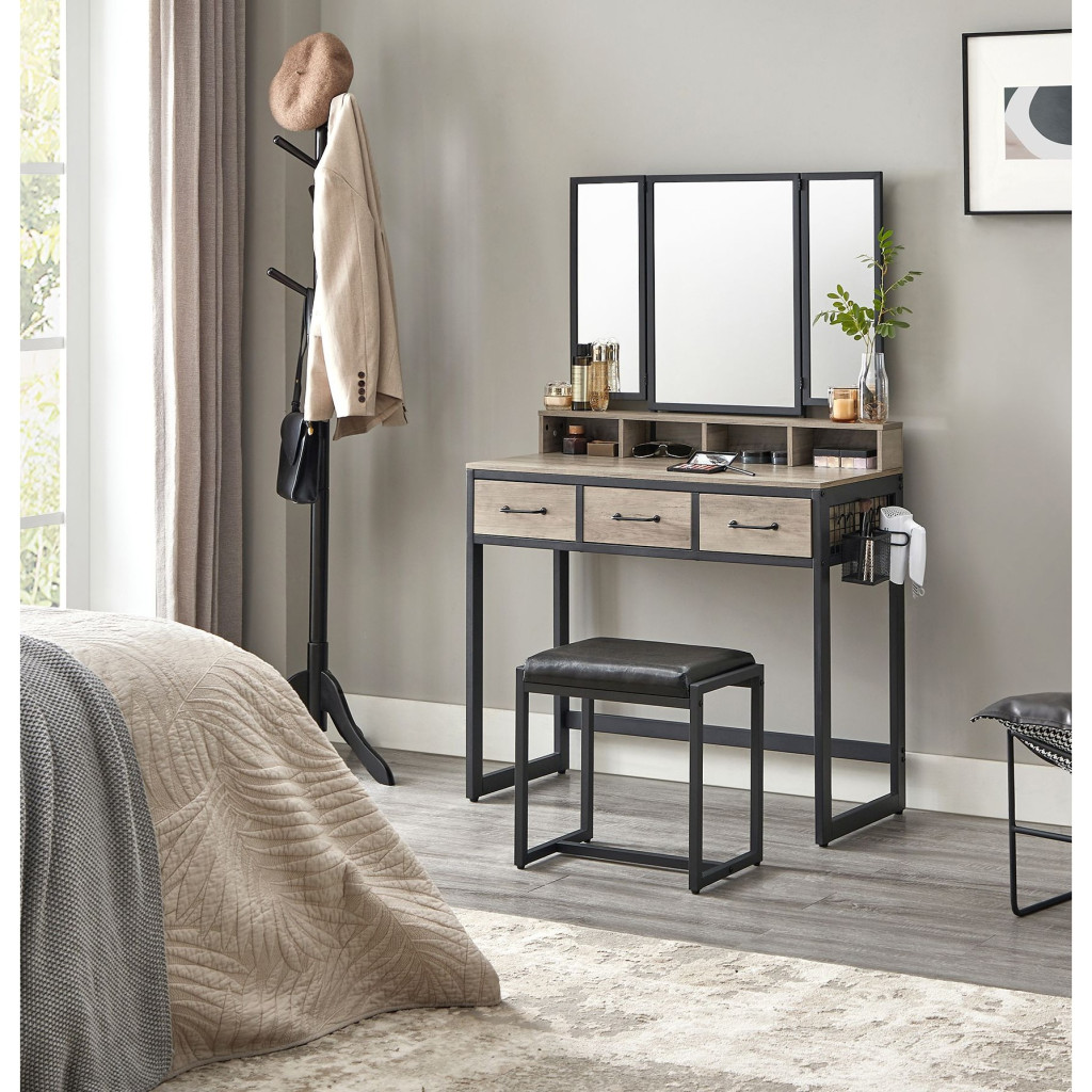 VASAGLE Fésülködőasztal, sminkasztal tükörrel fiókokkal párnázott székkel, greige 90x40x140cmSzabadítsd fel a tetejét: Ki szeretne sminkelni úgy, hogy közben szemhéjfestékek, rúzsok és ceruzák halmai veszik körül? Senki! A 3 tágas fiókkal itt az ideje, hogy kiürítsd a tetejét egy rendezett megjelenés érdekében.