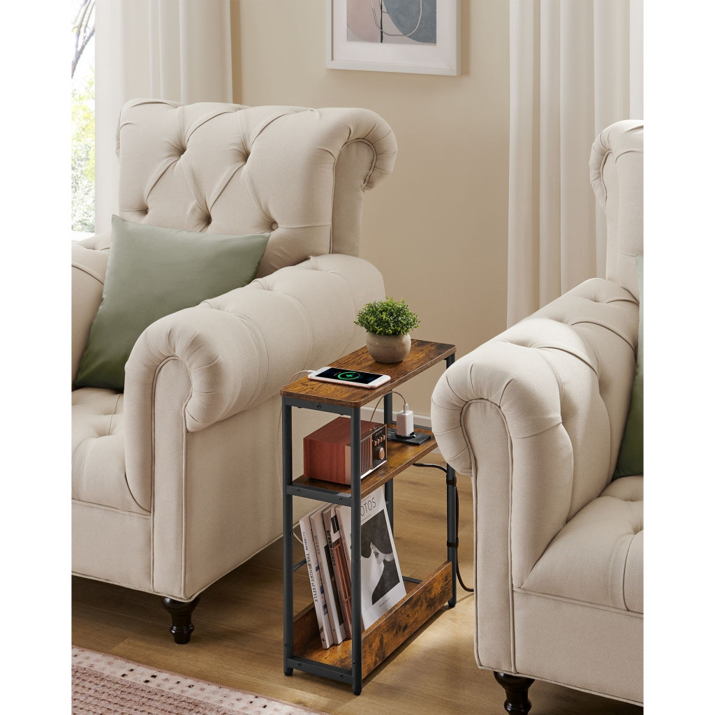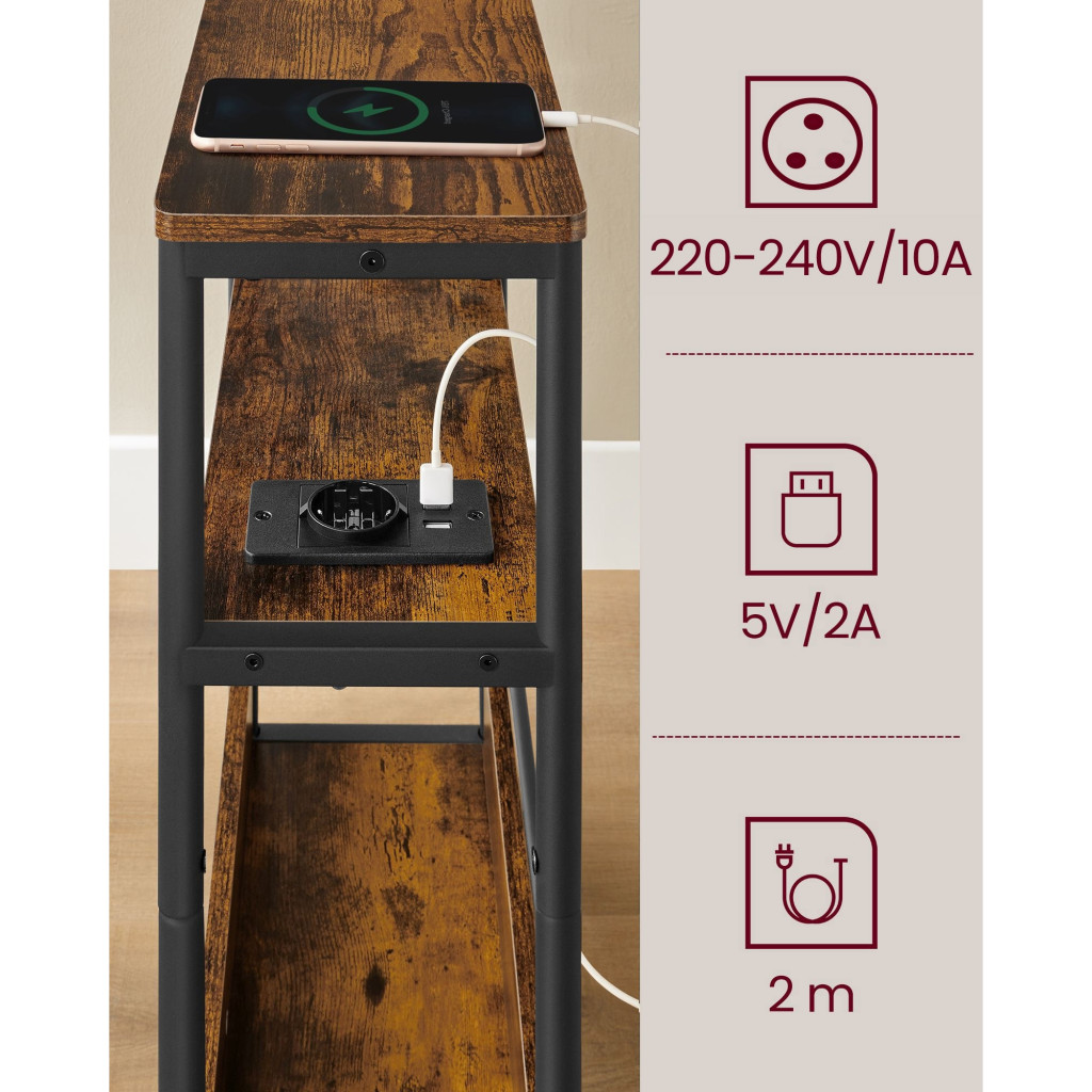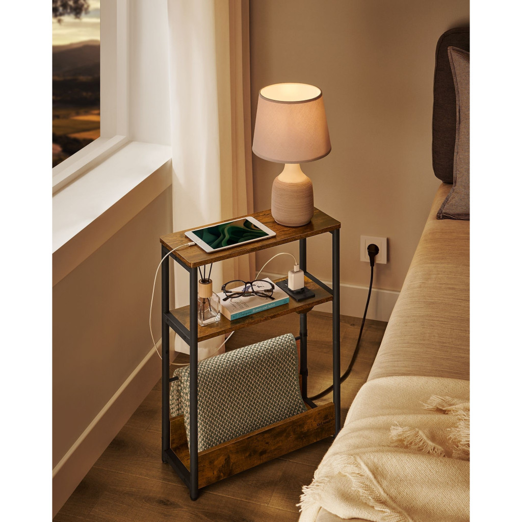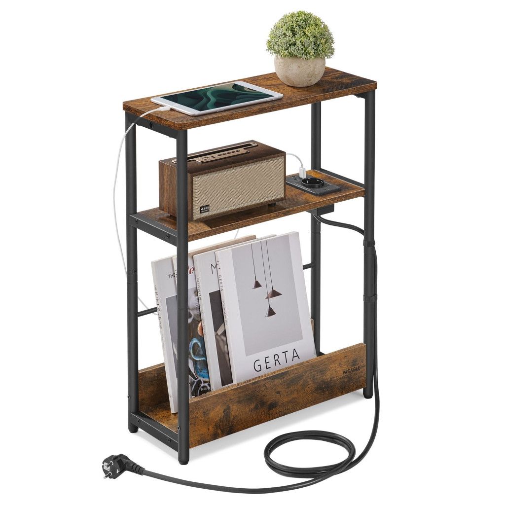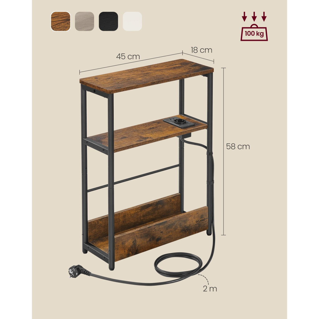 VASAGLE Keskeny lerakóasztal, éjjeli szekrény, 3 szintes, beépített elosztóval, rusztikus barna 45x18x58cmKis helyekhez illeszkedik: Az éjjeliszekrény méretei 18 x 45 x 58 cm, így tökéletesen illeszkedik kis helyekre, a kanapé vagy az ágy mellé, lehetővé téve a jobb helykihasználást.