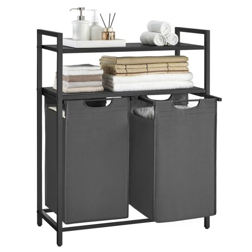 VASAGLE Szennyestartó, polccal kihúzható és levehető ruhatartó zsákkal 2x46L, fekete-szürke2 rekesz a szennyes szétválogatásához: A szennyes szétválogató rendszer teljes kapacitása: 92 liter (46 liter rekeszenként). A 2 rekesz segít külön tárolni a szennyest színek vagy típusok szerint.