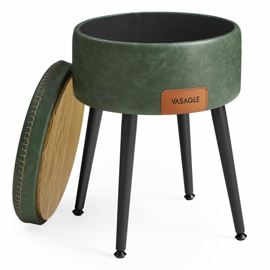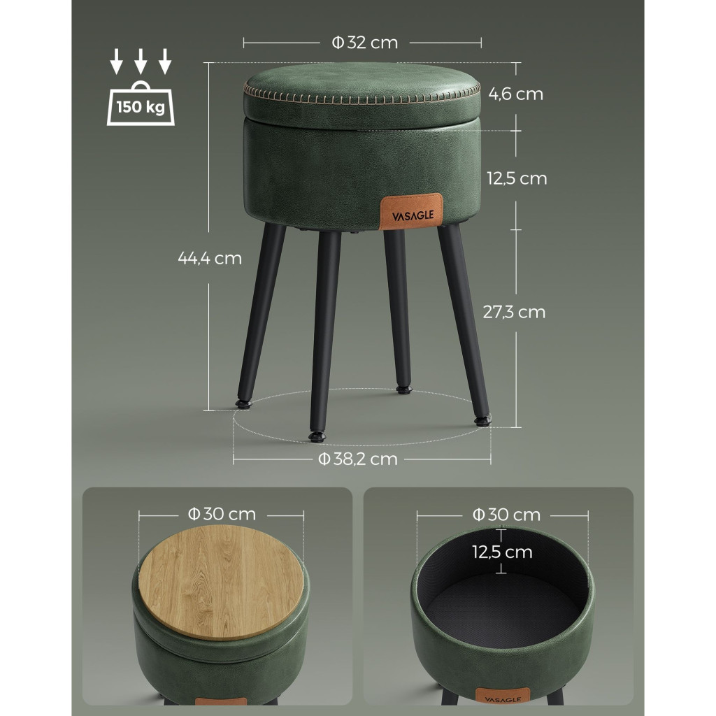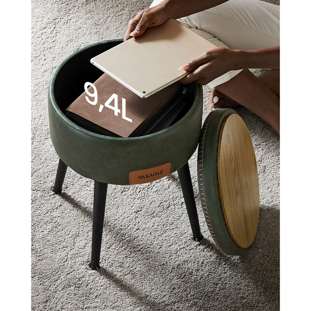 VASAGLE ECHO kerek tároló puff acél lábakkal, műbőr borítással és varrással, zöldBáj és sokoldalúság: Ez a bútordarab használható öltözőasztal székeként, karosszék lábtartójaként vagy egyszerűen oldalasztalként, ha megfordítja a felső részt. 9,4 literes térfogatával tökéletes a kisebb tárgyak tárolására.