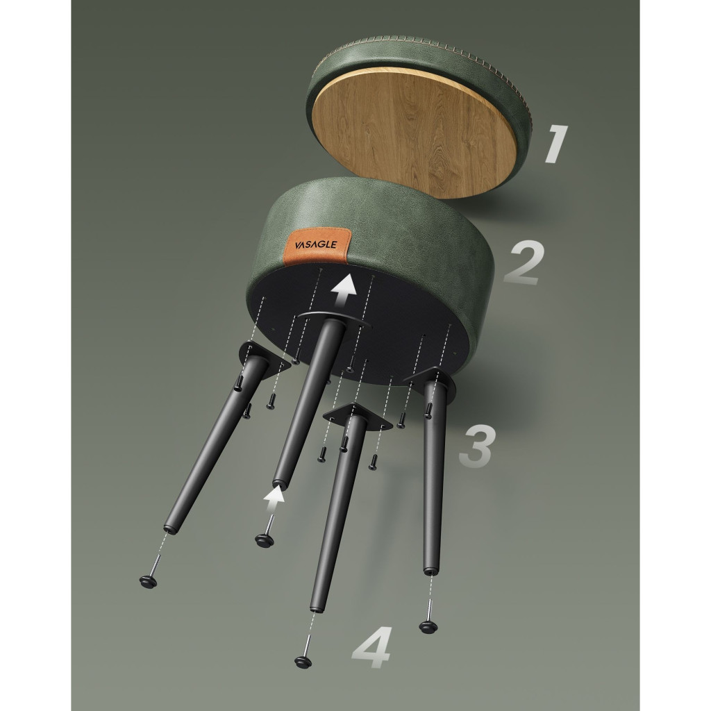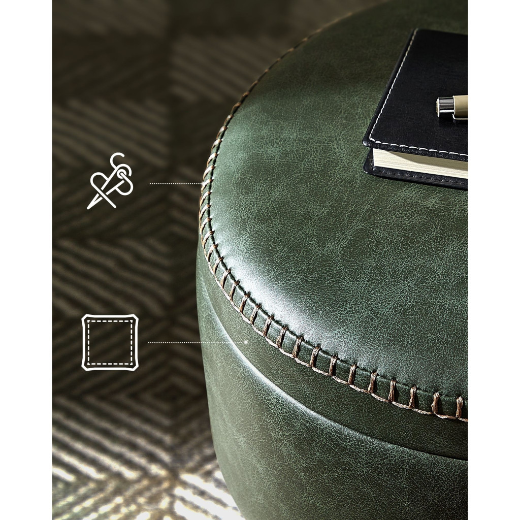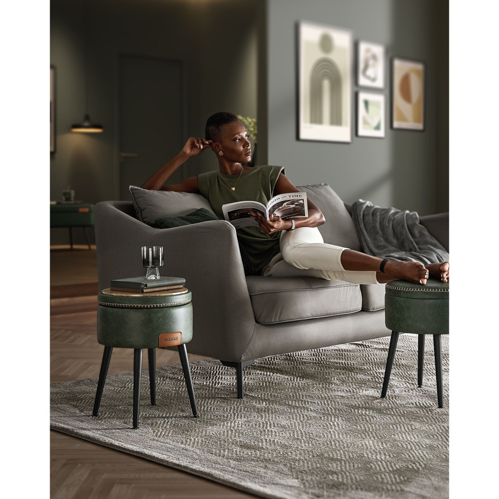 VASAGLE ECHO kerek tároló puff acél lábakkal, műbőr borítással és varrással, zöldBáj és sokoldalúság: Ez a bútordarab használható öltözőasztal székeként, karosszék lábtartójaként vagy egyszerűen oldalasztalként, ha megfordítja a felső részt. 9,4 literes térfogatával tökéletes a kisebb tárgyak tárolására.