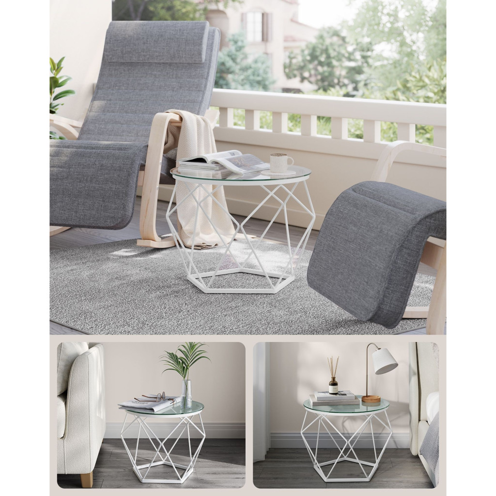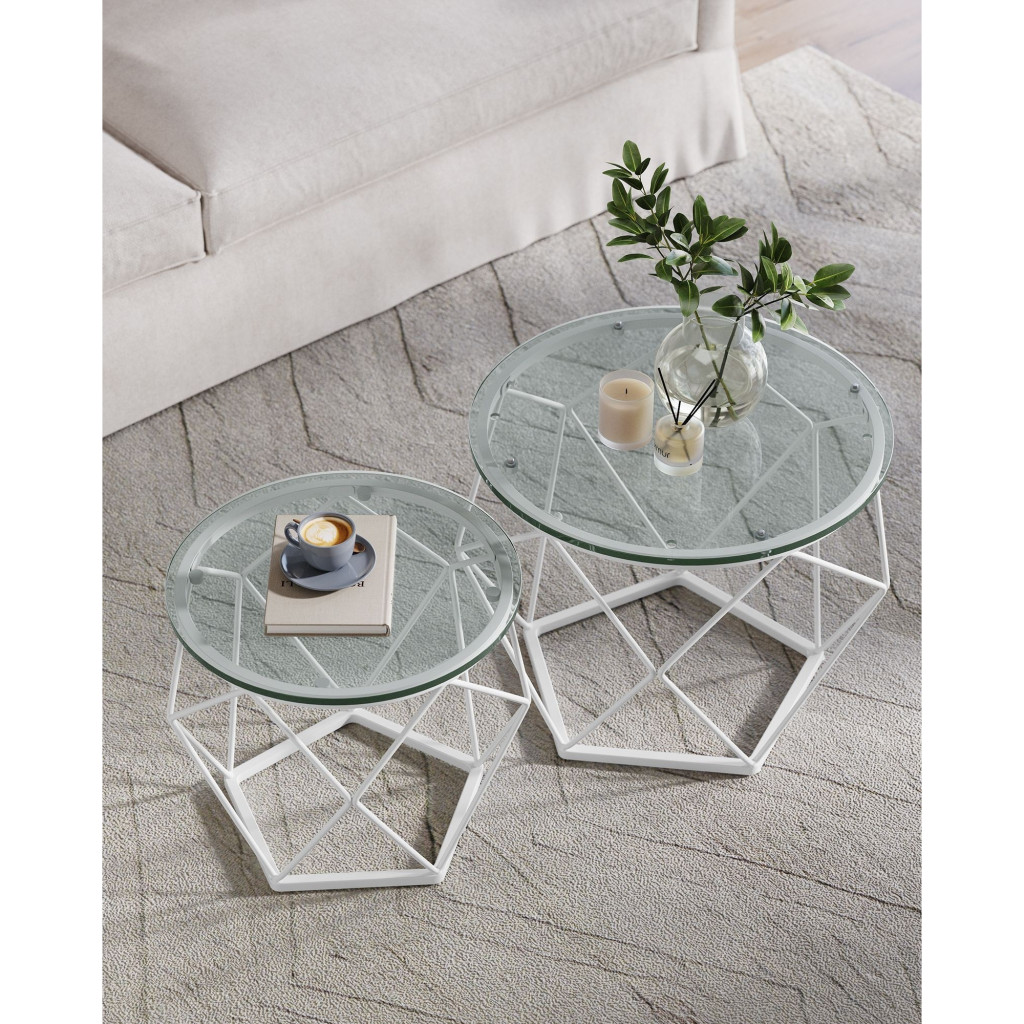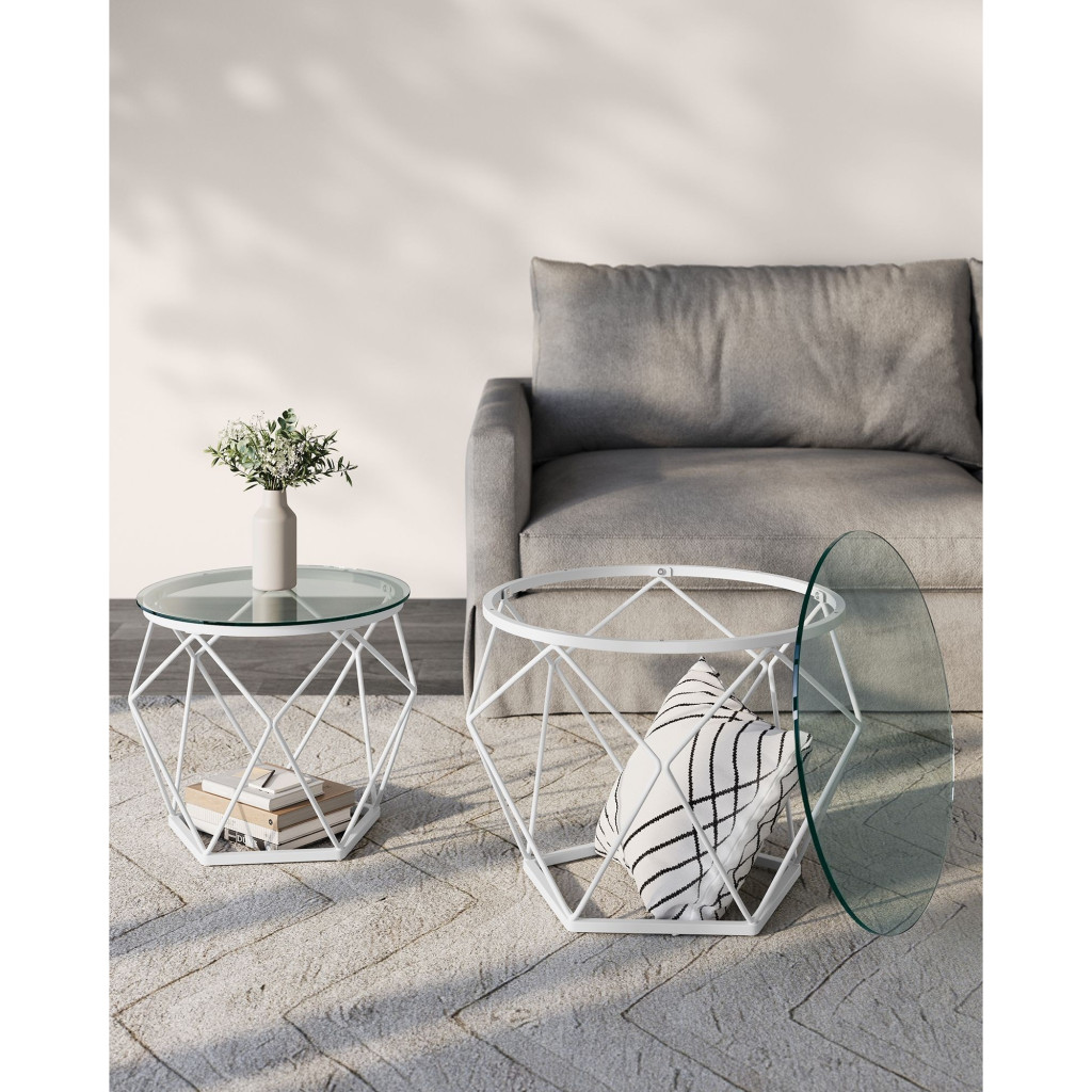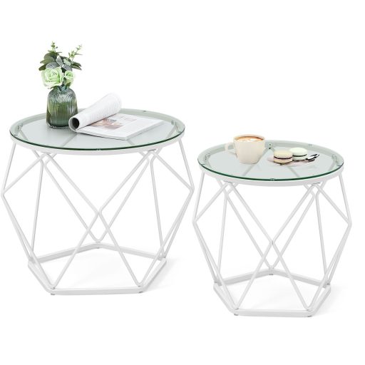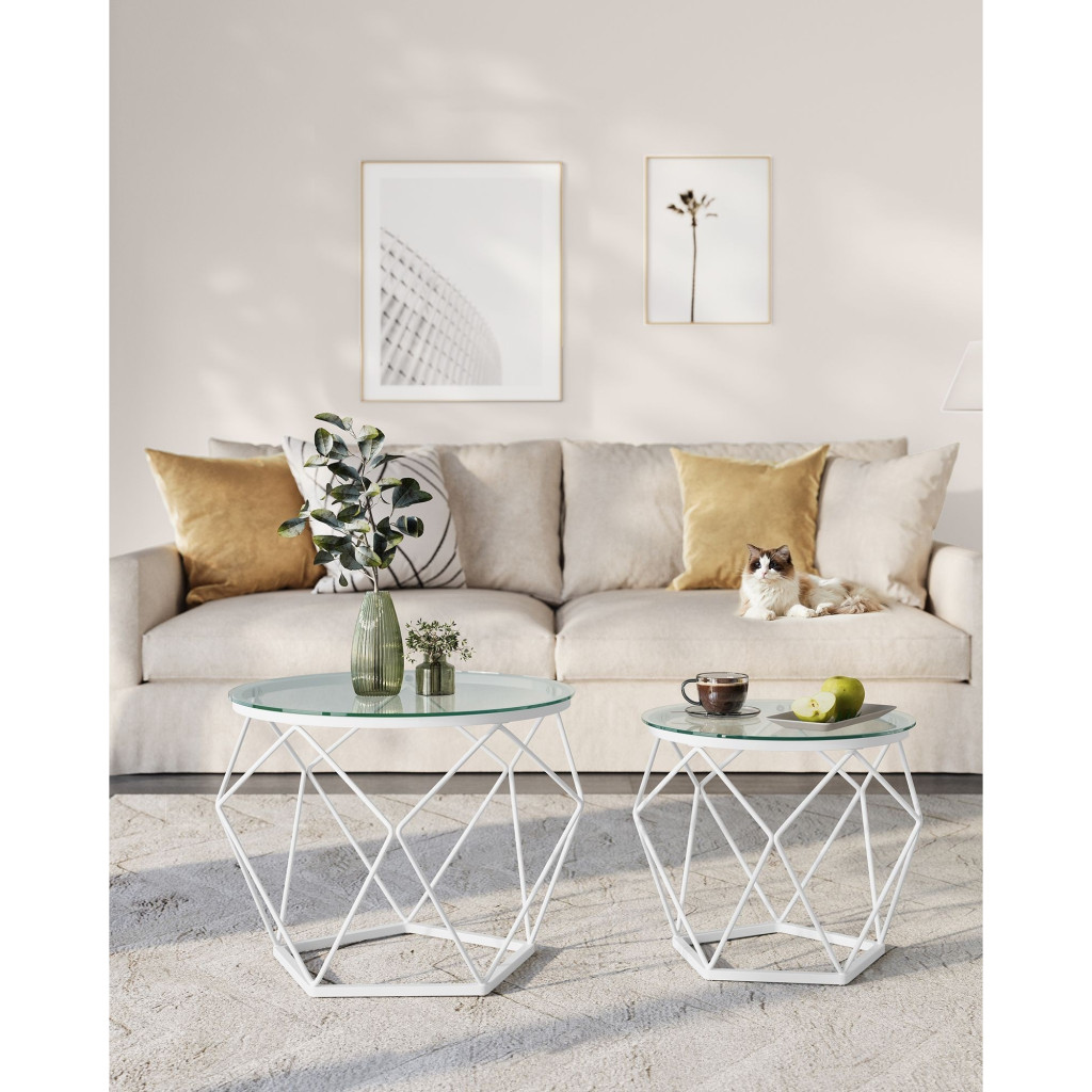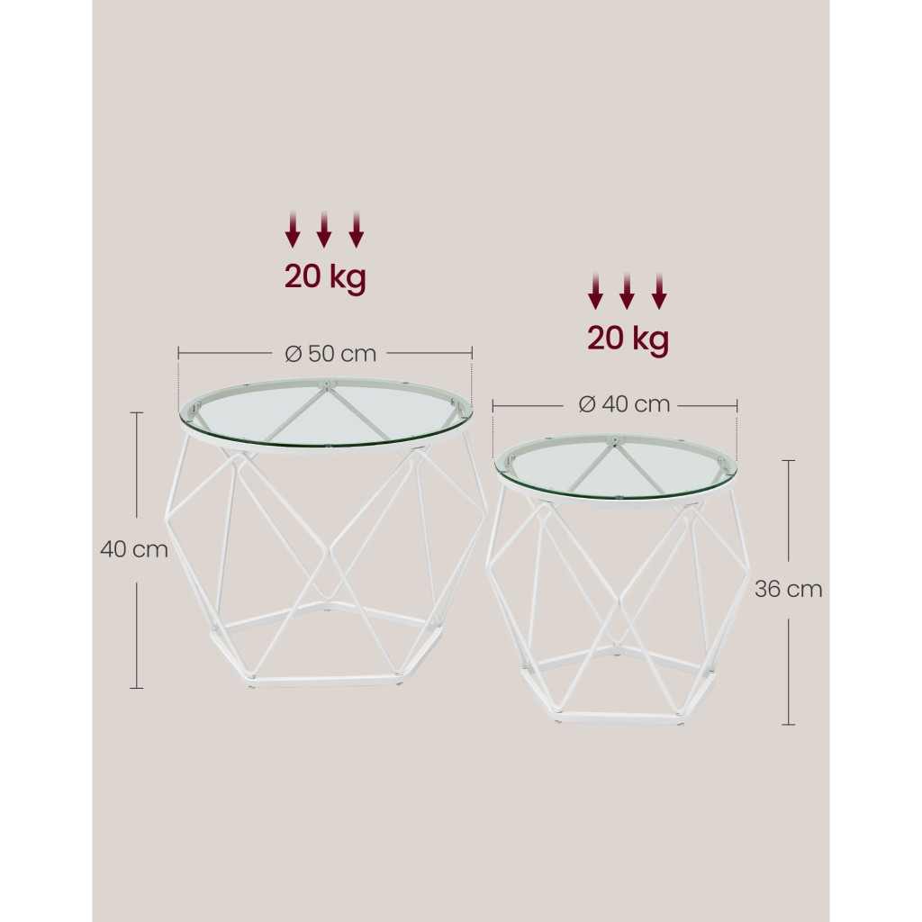 VASAGLE 2 darabos dohányzóasztal szett, üveg lappal fehér 50x50x40cm Kompakt Méret: A nagy dohányzóasztal méretei 50 x 40 cm (Átm. x M), a kis dohányzóasztal méretei pedig 40 x 36 cm (Átm. x M); a kompakt méret, amely alkalmas kis terekbe, lehetővé teszi, hogy megtalálja a megfelelő helyet a délutáni teához, dekorációkhoz vagy egy laptophoz a munkához