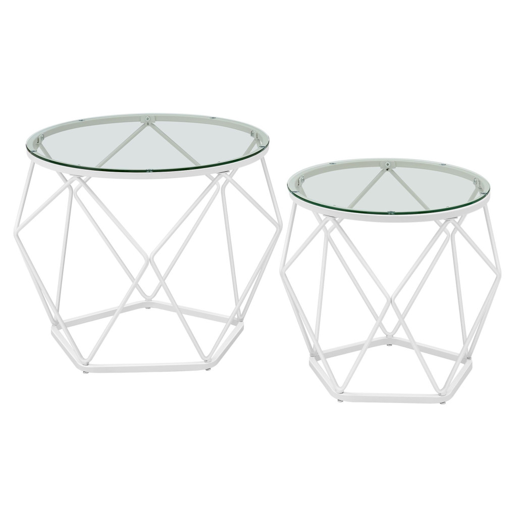 Modern Stílus: Ezek a modern stílusú dohányzóasztalok különleges hangulatot hoznak a nappalijába, kerek átlátszó tetejükkel és geometrikus fehér acél alapjukkal. Vonzó megjelenésük lenyűgözi vendégeit