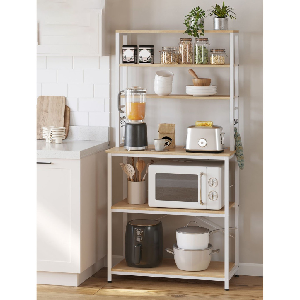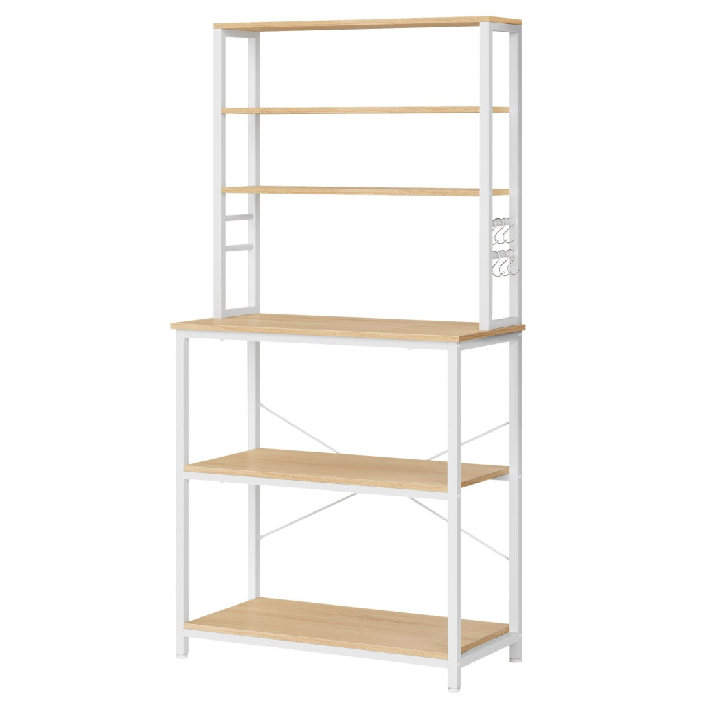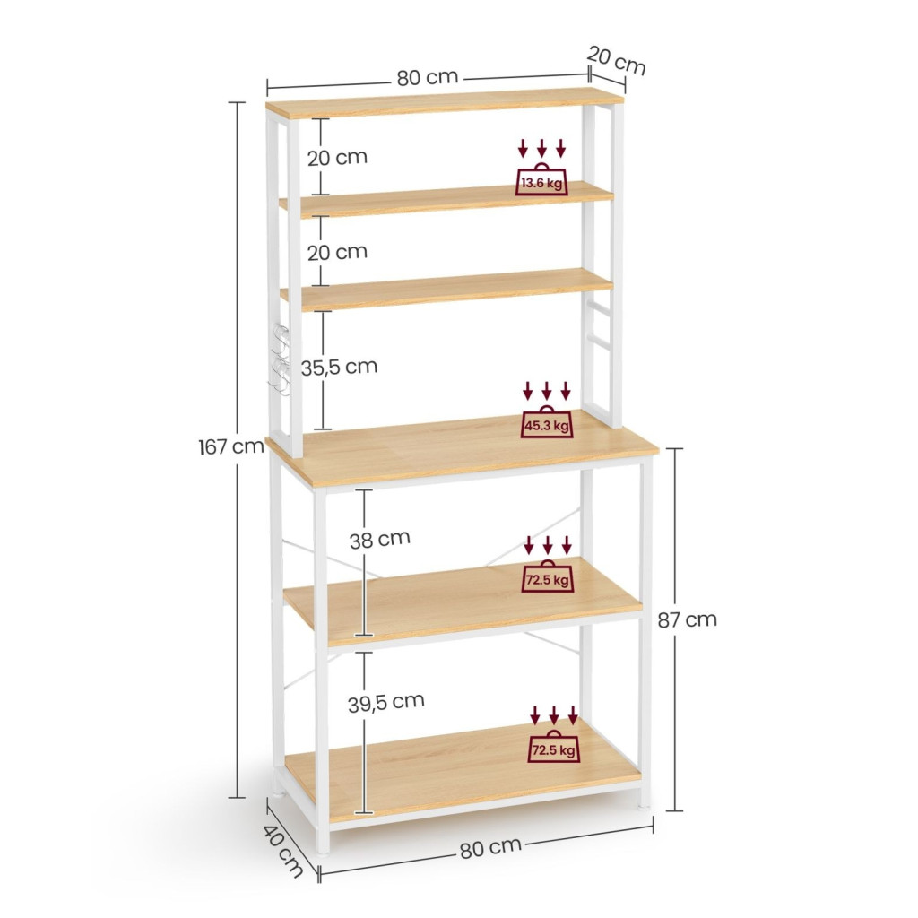 VASAGLE Konyhai állópolc 6 polcszinttel, 6 akasztóval, tölgy és fehér 80x40x167cm'[Tágas] Takarítson meg helyet a konyhapulton ezzel a tágas konyhai állvánnyal - 3 felső polc a fűszertartóknak, 3 nagy alsó polc a konyhai eszközöknek, és 6 S alakú kampó a szerszámoknak. Ez a mindent egyben polc rendet teremt a konyhájában.
